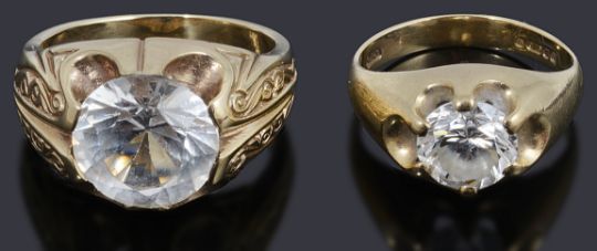 Two gentleman's 9ct gold single stone cubic zirconia signet rings