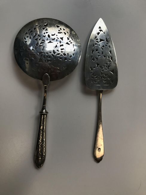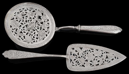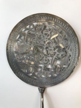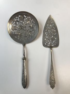 An early 20th century Persian silver serving slice and and near matching  skimmer the slice marked for Isfahan, the slice and skimmer both with pierced foliate engraved, the skimmer with filled handle, (2) first length 26 cm., weighable silver approx. 2.67 ozt.Condition: Fair condition commensurate with age. Skimmer unmarked.