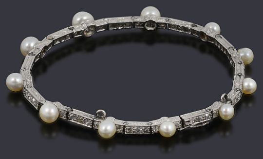 designed as a series of graduated pearls, peg set, between bar links each set with graduated eight cut diamonds to a concealed clasp. unsigned, accompanied by a Gem and Pearl Laboratory report numbered 19017 dated 2nd October 2020 stating that the 10 pearls are Natural Saltwater and 1 nucleated cultured pearl