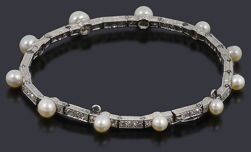 Condition: Unhallmarked: tested and valued as Platinum, Good, some tarnish and wear to the links, safety clasp deficient 10 x natural button shaped saltwater pearls: cream/pink lustre 1 x cultured pearl. Possibly a replacement 55 x eight cut diamond Total estimated diamond weight: 1.56ct Total weight: 18.6g