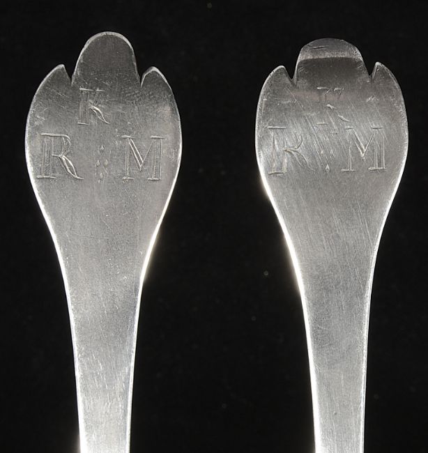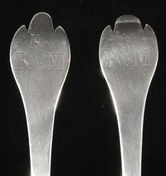 with beaded rat tail oval bowls, the backs engraved k over R M, (2)