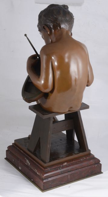 Emmanuel Villanis (French 1858-1914) a bronze figure of a boy entitled '"Enfant du Pecheur"signed by the foot Villanis, the seated young boy holding a sailing boat and resting on a stool, with multi-hued patination with Parisienne foundry mark for 'Bronze Garanti du titre Paris', raised on a red veined baseheight 63cm., 30cm depthCondition: The mast unscrews and is present. All appears to be in good condition with no obvious damage.Please note that due to the size, collection is required by 4pm on Friday 6th at Farleigh Court Golf Club