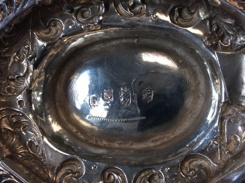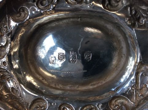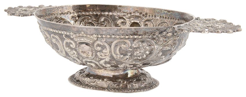 An 18th century Dutch silver twin handled brandy bowl marked for Friesland, other marks indistinctof oval form, the part lobed bowl embossed with crowns, flowers and foliage, having twin cast flat pierced figural handles centred by a mask on a domed spreading foothandle to handle 24.7 cm., weight approx. 6.16 ozt. Condition: Small patch repair to underside of foot otherwise fair condition commensurate with age.