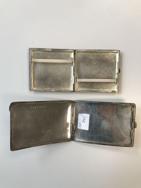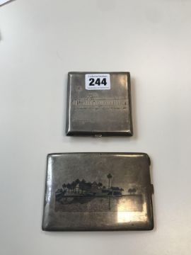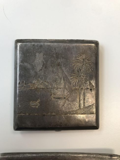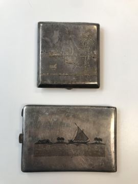 first, of curved rectangular form with niello decoration depicting a river scene with buildings and palms, second, stamped 935, sterling, of square form engraved with a river scene with palms, (2)