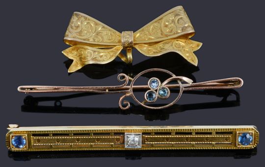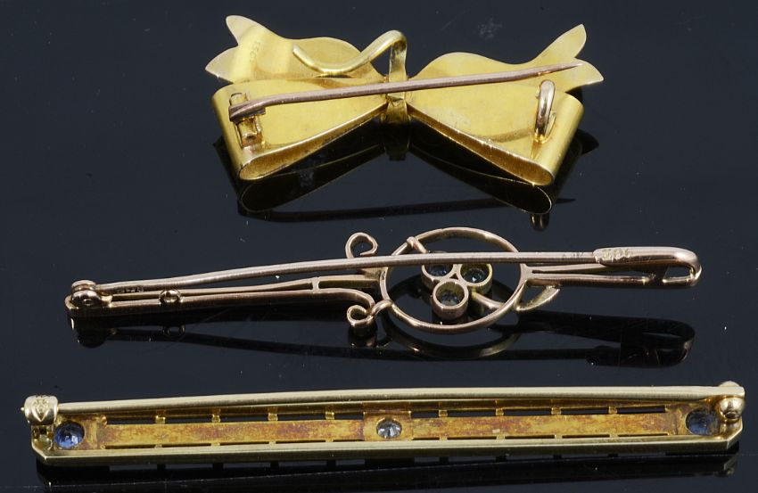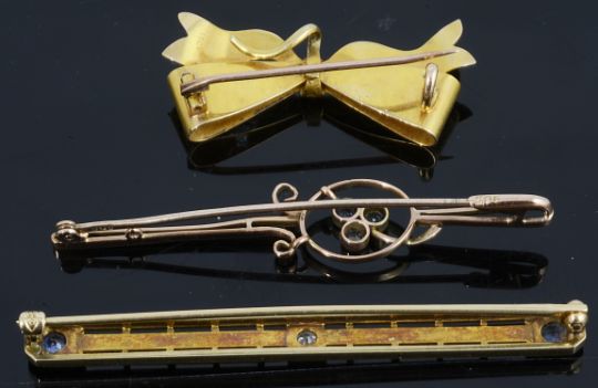 sapphire bar brooch: 4.0g, bow: 2.8g, three stone brooch: 1.8g