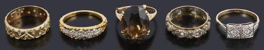 Five assorted gold gem set rings