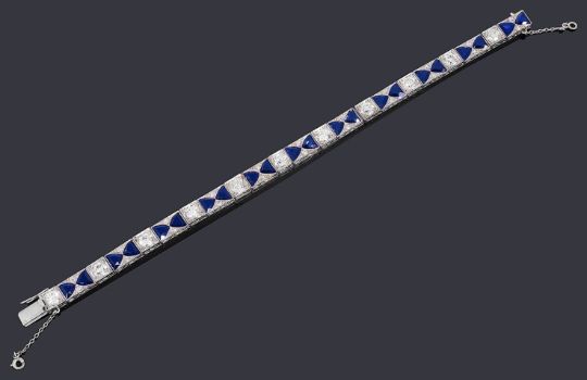 A diamond and sapphire line bracelet,brilliant cut diamonds grain set to square links alternating with millegrain set pairs of triangular calibre-cut sapphires, with further eight-cut diamonds between each sapphire pair, to a concealed clasp with safety chain. French control mark for Platinum, Lozenge shaped makers mark.total weight: 21.5gCondition: French control mark for Platinum, Lozenge mark possibly for Van Cleef and Arpels11 x diamond measurements: 4.33mm x 4.67mm x 3.20mmEstimated carat weight: 0.41ctTotal estimated carat weight: 4.51ctCondition: good