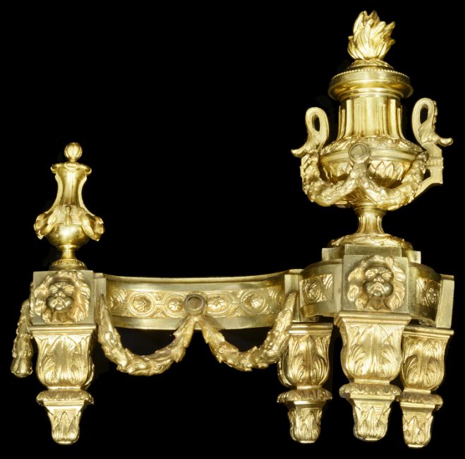 A pair of late 19th century French Louis XVI style ormolu chenets c.1900having flaming urn finial, decorated with garlands and masks, on tapered square acanthus leaf supports (2)height 40.5 cm., length 38 cm.Condition: Fair condtionPlease note that due to the size, collection is required by 4pm on Friday 6th at Farleigh Court Golf Club
