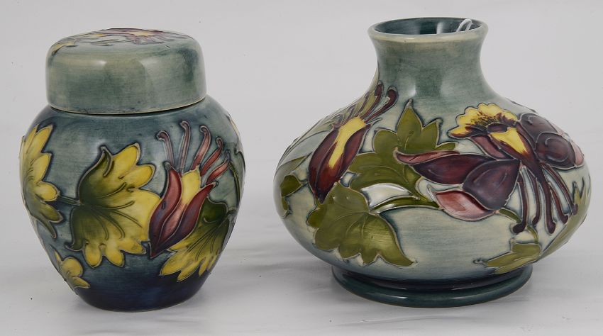 A Walter Moorcroft 'Columbine' squat vase and small ginger