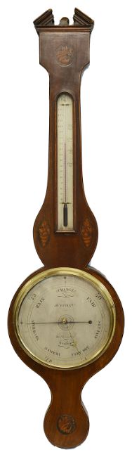 A late George III mahogany wheel barometer by Cetti and Co.with 9-inch silvered dial, contained within a mahogany case with inlaid shell motif and boxwood stringinglength 95cmCondition: Appears to be in working condition. Some general wear to case.Cetti and Co. were working at Red Lion Street between 1803-1815Please note that due to the size, collection is required by 4pm on Friday 6th at Farleigh Court Golf Club