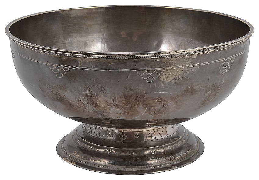 of circular form with plannished decoration, the rim with an applied fine rope-work border above a stylised engraved band, on spreading circular foot engraved 'Auspicium Melioris Aevi', bears inscription to interior E.S.S. - E.T.G 1924-1929
