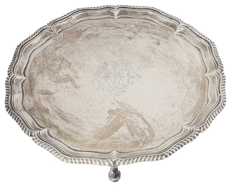 of circular form with piecrust border and gadrooned rim, on three feet, engraved with initials