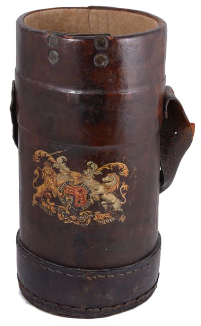 with leather strap handle and decorated with the Royal coat of arms