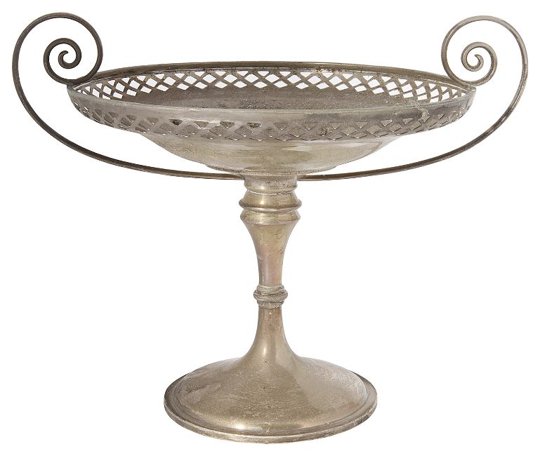 having twin spiral handles, the bowl with upturned pierced trellis border, on a pedestal foot engraved to the underside with a presentation inscription