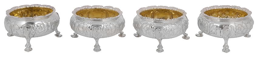 of typical form with foliate embossed decoration and gadrooned rims, raised on three legs with pad feet, interiors gilt, (4)