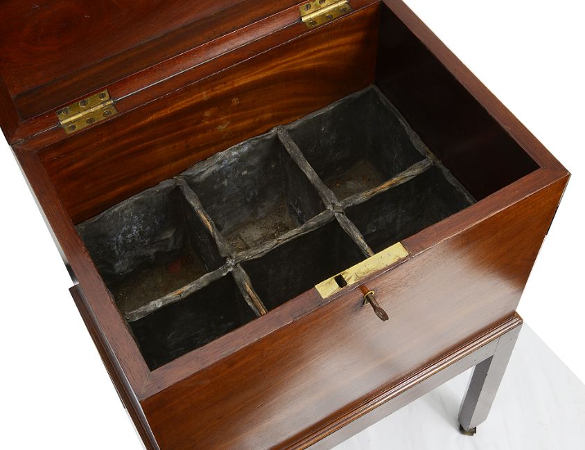 A George III mahogany cellaret of rectangular shape, the hinged lid with moulded edge enclosing a lead lined six division interior, on square chamfered legs and brass castorsheight 70 cm., width 46.5 cm., depth 33 cm.Condition: Some fading to lid and rear. Lid would appear to have been repolished. Original lock and key present. Please note that due to the size, collection is required by 4pm on Friday 6th at Farleigh Court Golf Club