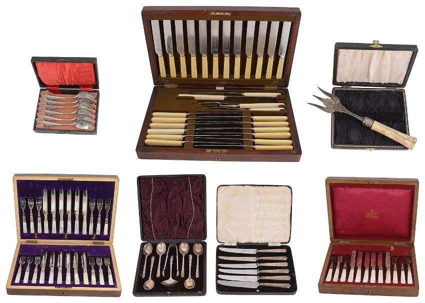 comprising an Edwardian octagonal baluster form sugar caster, London, 1904 by The Goldsmiths & Silversmiths Co., a brandy decanter label, a set of six Hanoverian pattern coffee spoons and matching sugar tongs, another matching set of six coffee spoons, a pair of pickle forks with twisted stems and thistle terminals, stamped sterling, a pair of napkin rings with rope twist border, another pair a/f and a cased set of six silver handled tea knives together with plated items to include a mahogany cased set of twelve mother of pearl handled fruit knives and forks, a similar oak cased set of six fruit knives and forks by Mappin & Webb, a mahogany cased set of ivory handled table and dessert knives with carving set etc., (qty)