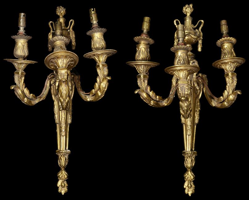 A pair of 19th century French Louis XVI style ormolu three light wall appliques