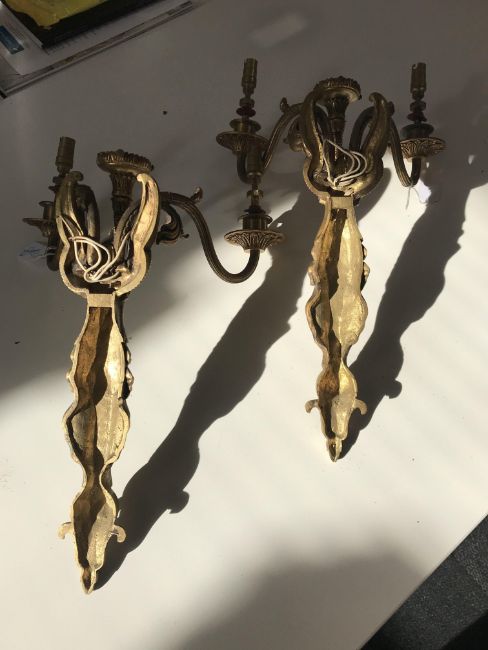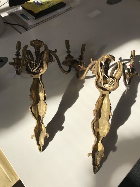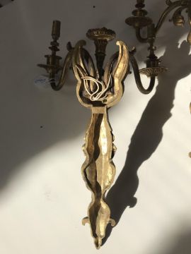 A pair of early 20th century French Empire style three light ormolu wall appliques