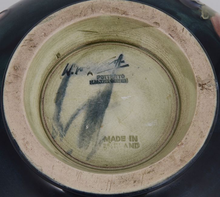the tube lined decoration on a dark green ground, with painted and impressed marks to base