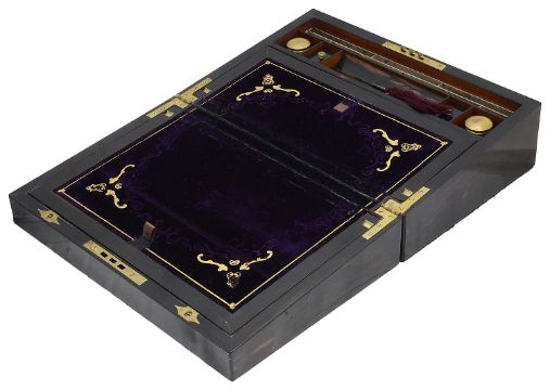 Condition: The gilt on the velvet has been later added, possibly later added sectioned compartment, inkwells possibly later, some cracking to the outside wood from age, small section of veneer missing from by the hinge. Overall good condition