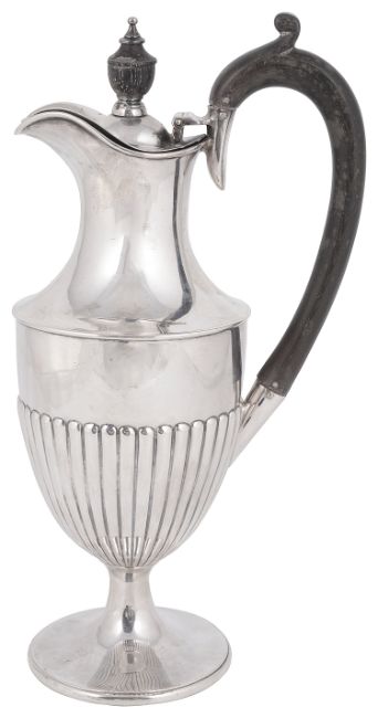 of half fluted vase form, having hinged cover with ebony scroll handle and urn finial, on a weighted pedestal foot