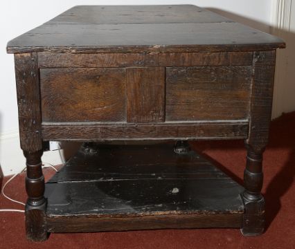A mid 17th century oak credence table with cupboardthe two plank top above a cupboard below enclosed by a central door carved with geometric design to canted sides, on turned legs united by an under tier terminating in block feetheight 72.5 cm., width 86 cm., depth 48 cm.Condition: Fair condition. Some movement and shrinkage to two plank top. Late cathc to cupboard doorDue to the size, collection is required by 4pm on Friday 6th from Farleigh Court Golf Club