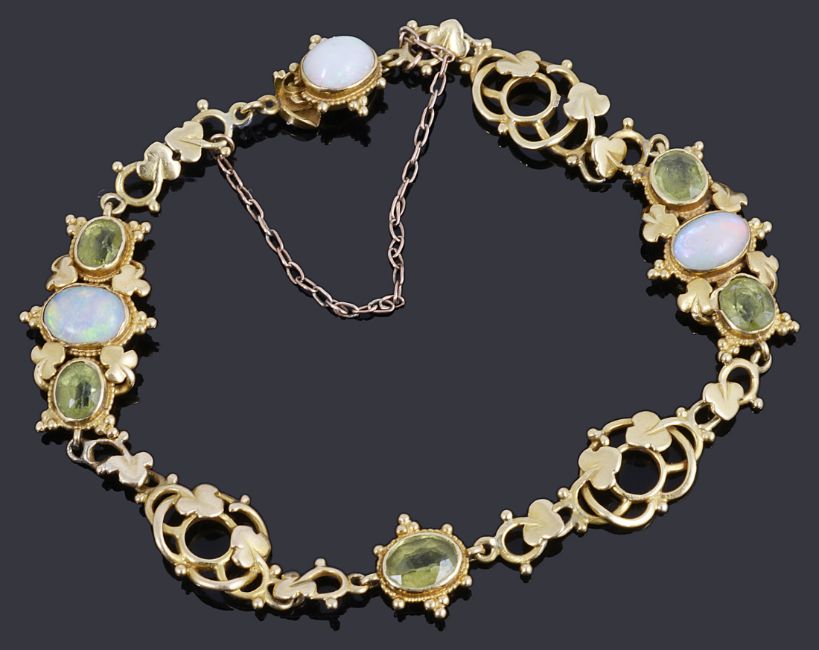 having opal cabochons flanked with oval cut peridots, rub set to panels of scrolling vine leaves with bead detailed bracelet, with a opal cabochon set concealed clasp and safety chain