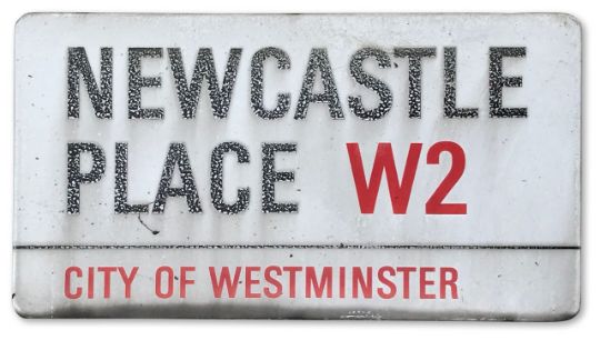 An enamelled iron street sign for Newcastle Place W2, City of Westminster with iconic black and red sans serif lettering first created by Sir Misha Black in 1967 which is unique to the Westminster signs and under copyright law, forbidden to be copied anywhere else in the world, sold together with a signed Certificate of Authenticity