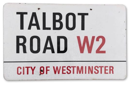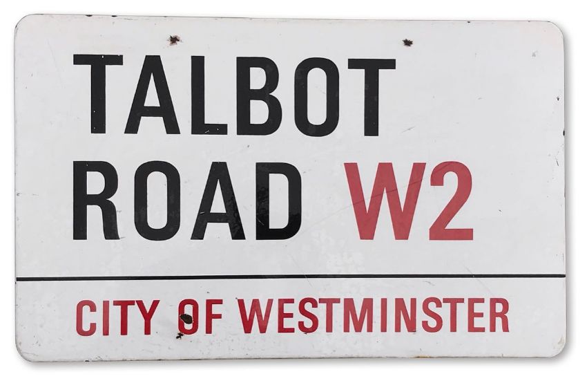 An enamelled iron street sign for Talbot Road W2, City of Westminster with iconic black and red sans serif lettering first created by Sir Misha Black in 1967 which is unique to the Westminster signs and under copyright law, forbidden to be copied anywhere else in the world, sold together with a signed Certificate of Authenticity