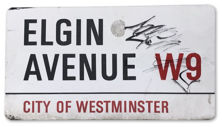 An enamelled iron street sign for Elgin Avenue W9, City of Westminster with iconic black and red sans serif lettering first created by Sir Misha Black in 1967 which is unique to the Westminster signs and under copyright law, forbidden to be copied anywhere else in the world, sold together with a signed Certificate of Authenticity
