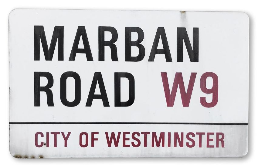 An enamelled iron street sign for Marban Road W9, City of Westminster, with iconic and black and red sans serif lettering first created by Sir Misha Black in 1967 which is unique to the Westminster signs and under copyright law, forbidden to be copied anywhere else in the world, sold together with a signed Certificate of Authenticity