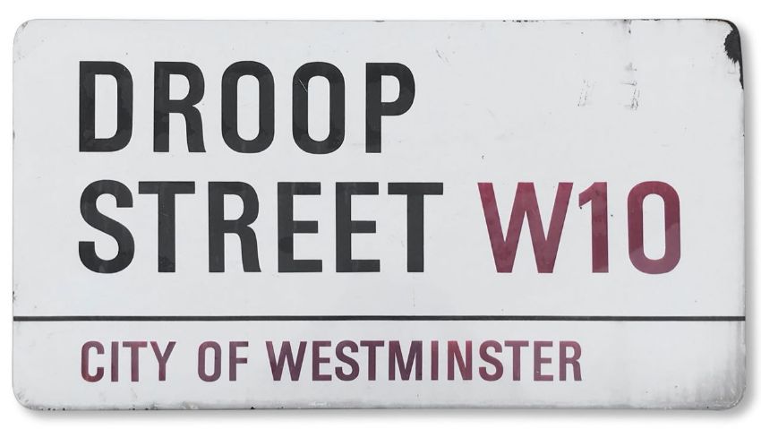 An enamelled iron street sign for Droop Street W10, City of Westminster, with iconic and black and red sans serif lettering first created by Sir Misha Black in 1967 which is unique to the Westminster signs and under copyright law, forbidden to be copied anywhere else in the world, sold together with a signed Certificate of Authenticity