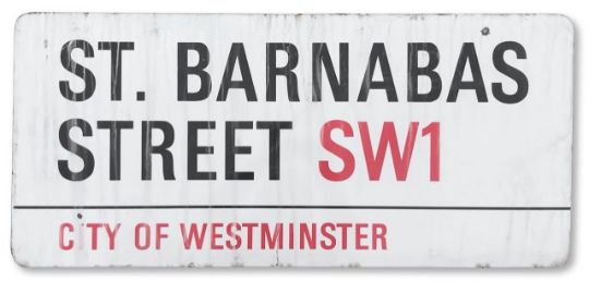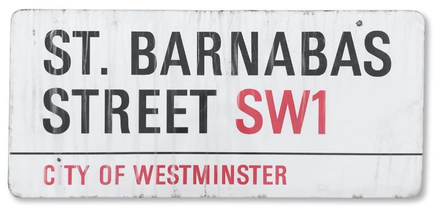 An enamelled iron street sign for St. Barnabas Street SW1, City of Westminster, with iconic and black and red sans serif lettering first created by Sir Misha Black in 1967 which is unique to the Westminster signs and under copyright law, forbidden to be copied anywhere else in the world, sold together with a signed Certificate of Authenticity