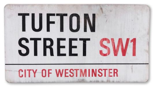 An enamelled iron street sign for Tufton Street SW1, City of Westminster, with iconic and black and red sans serif lettering first created by Sir Misha Black in 1967 which is unique to the Westminster signs and under copyright law, forbidden to be copied anywhere else in the world, sold together with a signed Certificate of Authenticity