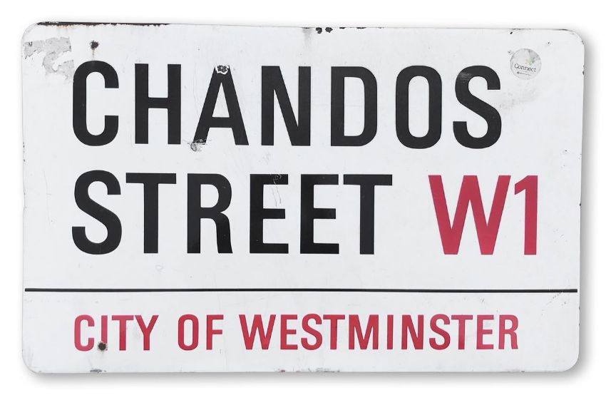 An enamelled iron street sign for Chandos Street W1, City of Westminster, with iconic and black and red sans serif lettering first created by Sir Misha Black in 1967 which is unique to the Westminster signs and under copyright law, forbidden to be copied anywhere else in the world, sold together with a signed Certificate of Authenticity