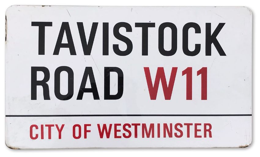 An enamelled iron street sign for Tavistock Road W11, City of Westminster with iconic black and red sans serif lettering first created by Sir Misha Black in 1967 which is unique to the Westminster signs and under copyright law, forbidden to be copied anywhere else in the world, sold together with a signed Certificate of Authenticity