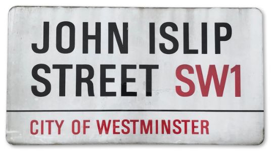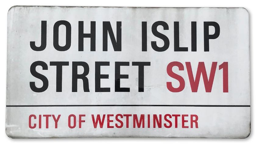 An enamelled iron street sign for John Islip Street SW1, City of Westminster with iconic black and red sans serif lettering first created by Sir Misha Black in 1967 which is unique to the Westminster signs and under copyright law, forbidden to be copied anywhere else in the world, sold together with a signed Certificate of Authenticity