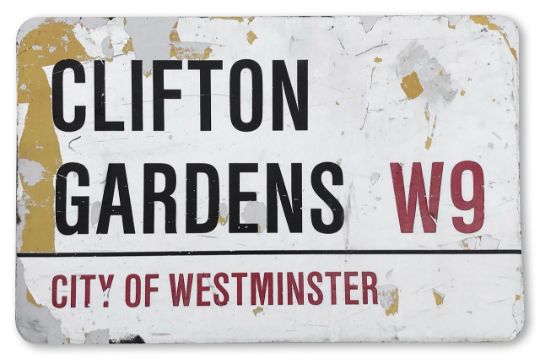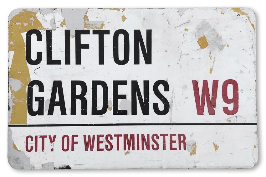 An aluminium sheet sign for Clifton Gardens W9, City of Westminster, with iconic and black and red sans serif lettering first created by Sir Misha Black in 1967 which is unique to the Westminster signs and under copyright law, forbidden to be copied anywhere else in the world, sold together with a signed Certificate of Authenticity