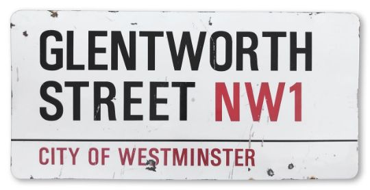 An enamelled iron street sign for Glentworth Street NW1, City of Westminster, with iconic and black and red sans serif lettering first created by Sir Misha Black in 1967 which is unique to the Westminster signs and under copyright law, forbidden to be copied anywhere else in the world, sold together with a signed Certificate of Authenticity