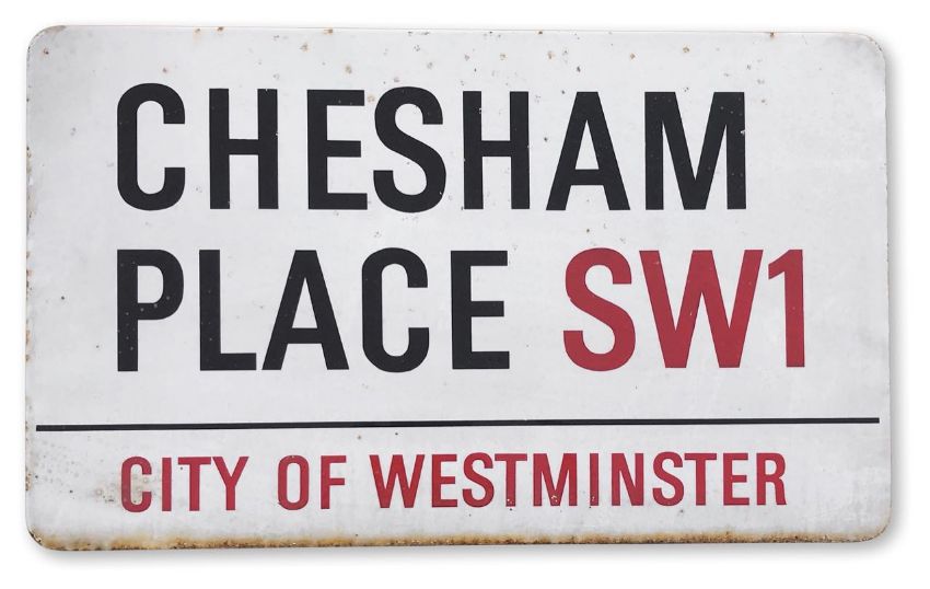 An enamelled iron street sign for Chesham Place SW1, City of Westminster, with iconic black and red sans serif lettering first created by Sir Misha Black in 1967 which is unique to the Westminster signs and under copyright law, forbidden to be copied anywhere else in the world, sold together with a signed Certificate of Authenticity