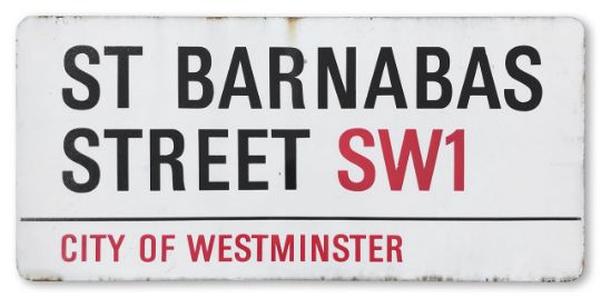 An enamelled iron street sign for St Barnabas Street SW1, City of Westminster, with iconic and black and red sans serif lettering first created by Sir Misha Black in 1967 which is unique to the Westminster signs and under copyright law, forbidden to be copied anywhere else in the world, sold together with a signed Certificate of Authenticity
