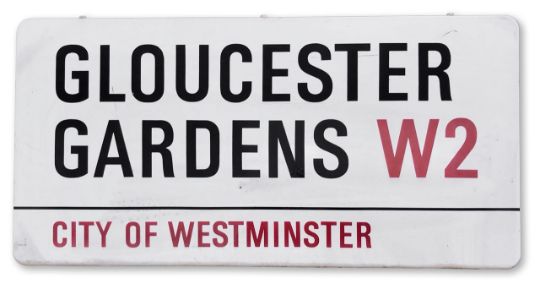 An enamelled iron street sign for Gloucester Gardens W2, City of Westminster, on part wooden frame to back, with iconic and black and red sans serif lettering first created by Sir Misha Black in 1967 which is unique to the Westminster signs and under copyright law, forbidden to be copied anywhere else in the world, sold together with a signed Certificate of Authenticity