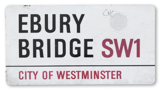 An enamelled iron street sign for Ebury Bridge SW1, City of Westminster, with iconic and black and red sans serif lettering first created by Sir Misha Black in 1967 which is unique to the Westminster signs and under copyright law, forbidden to be copied anywhere else in the world, sold together with a signed Certificate of Authenticity