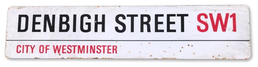 An enamelled iron street sign for Denbigh Street SW1, City of Westminster, with iconic and black and red sans serif lettering first created by Sir Misha Black in 1967 which is unique to the Westminster signs and under copyright law, forbidden to be copied anywhere else in the world, sold together with a signed Certificate of Authenticity