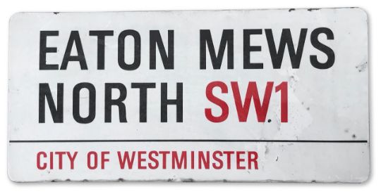 An enamelled iron street sign for Eaton Mews North SW1, City of Westminster with iconic black and red sans serif lettering first created by Sir Misha Black in 1967 which is unique to the Westminster signs and under copyright law, forbidden to be copied anywhere else in the world, sold together with a signed Certificate of Authenticity