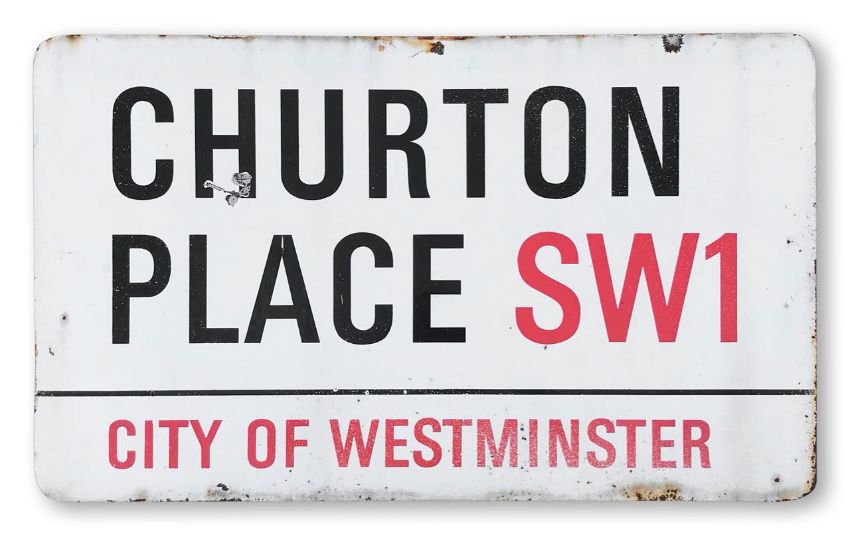 An enamelled iron street sign for Churton Place SW1, City of Westminster, with iconic and black and red sans serif lettering first created by Sir Misha Black in 1967 which is unique to the Westminster signs and under copyright law, forbidden to be copied anywhere else in the world, sold together with a signed Certificate of Authenticity
