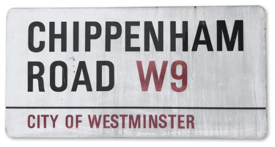 An enamelled iron street sign for Chippenham Road W9, City of Westminster with iconic black and red sans serif lettering first created by Sir Misha Black in 1967 which is unique to the Westminster signs and under copyright law, forbidden to be copied anywhere else in the world, sold together with a signed Certificate of Authenticity