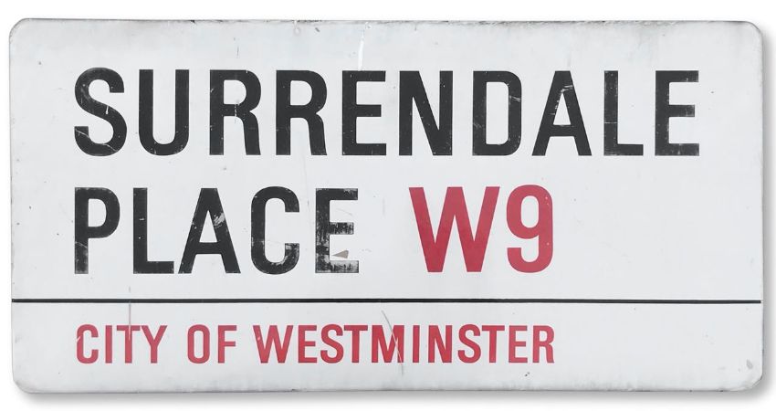 An enamelled iron street sign for Surrendale Place W9, City of Westminster, with iconic and black and red sans serif lettering first created by Sir Misha Black in 1967 which is unique to the Westminster signs and under copyright law, forbidden to be copied anywhere else in the world, sold together with a signed Certificate of Authenticity