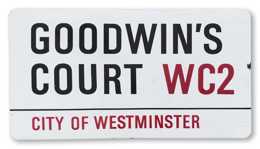 An enamelled iron street sign for Goodwin's Court WC2, City of Westminster, with iconic and black and red sans serif lettering first created by Sir Misha Black in 1967 which is unique to the Westminster signs and under copyright law, forbidden to be copied anywhere else in the world, sold together with a signed Certificate of Authenticity